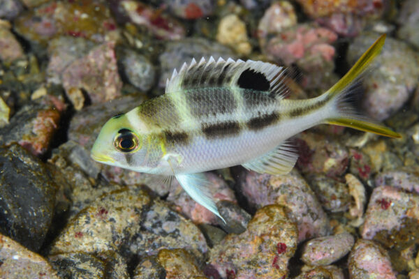 夜の海でもルビーのような輝きを見せる一際目立つ美しいテンジクダイ科の仲間です。