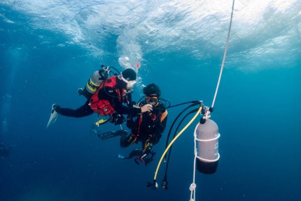 (写真は、DEEP講習時の減圧停止趣味レーションの様子)