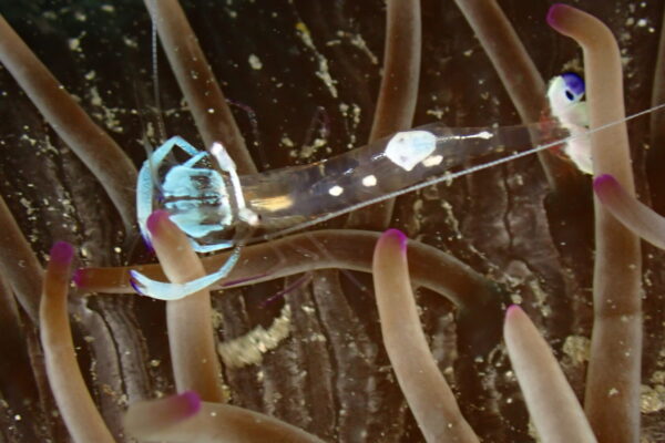 砂地のイソギンチャクを見て回れば、結構な確率で見つかる「オドリカクレエビ」。
