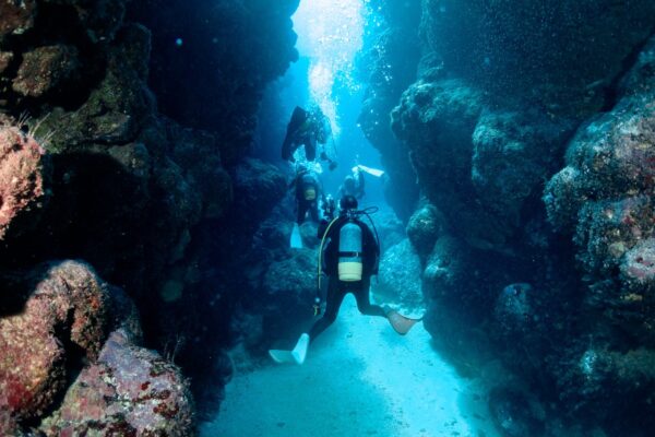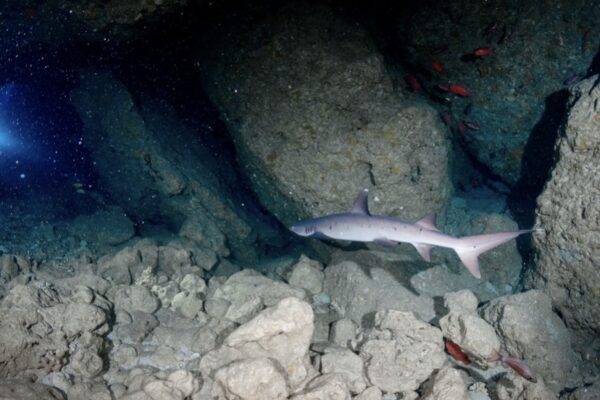 沖縄でよく見られる「ホワイトチップシャーク」が洞窟の中で