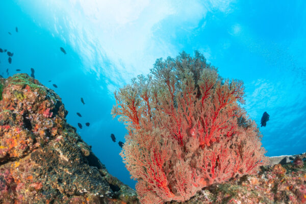 根の上のサンゴ群落にはキンギョハナダイとアジ・イサキの幼魚が駆け回っていました1!