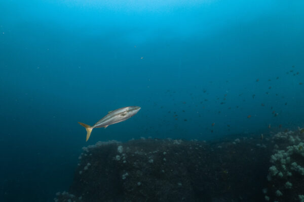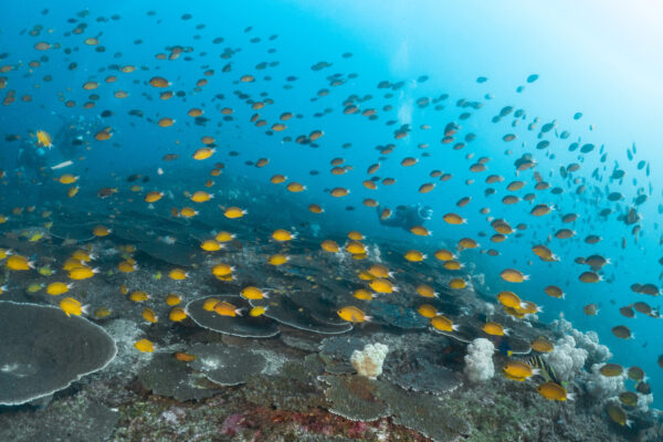 根の上・切れ目、中層を停めどなく動き続けるタカサゴの群れ。