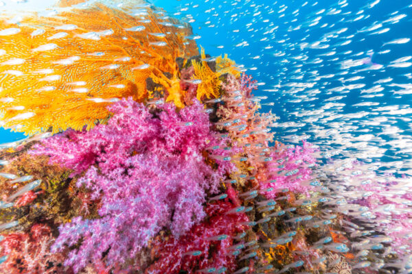 写真のようなソフトコーラルがわさわさ咲き誇るカラフルで賑やかな海を楽しむことができます。