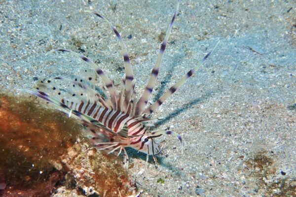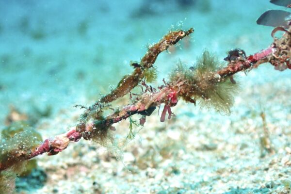 朽ちた木の枝や海藻に擬態しているタツノイトコ。