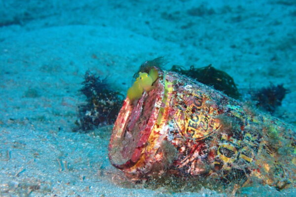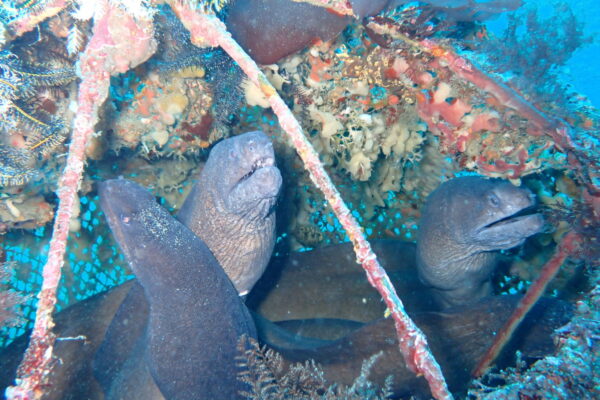 砂地に穴を掘って潜むことが多いオナガウツボはアミカゴの中を根城にしています。
