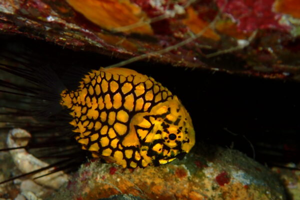 岩の合間に隠れてる黄金色に輝くマツカサウオ✨